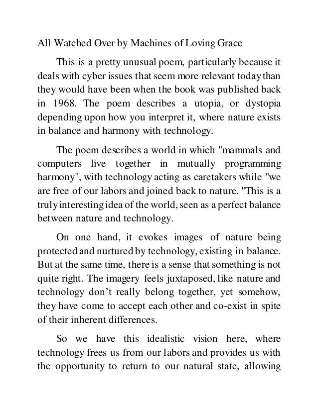All watched over by machines of loving grace. The poem imagines a world in which nature and machines have merged cybernetic meadows cybernetic forests cybernetic ecology seemingly without environmental destruction. Moreover the time of which we live in mutually programming harmony is symbolic of a Golden Age where humans and animals live watched over in peaceful accord with machines. It has been read as both a counterculture adoption of Cold War-era technological visions as well as an ironic.